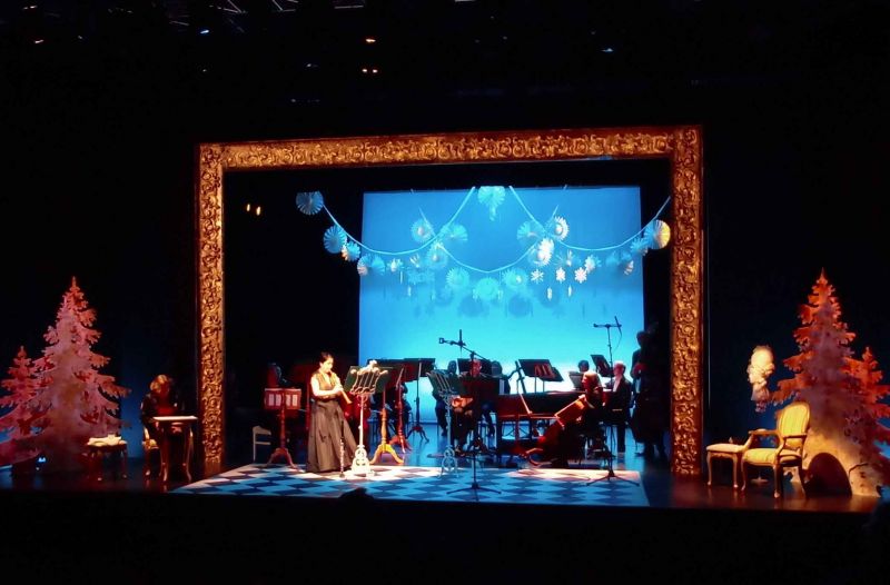 Intendant Steffen Menschings Weihnachtsgrüße in der Dekoration des Weihnachstkonzertes der Thüringer Symphoniker im Theaterhaus Rudolstadt